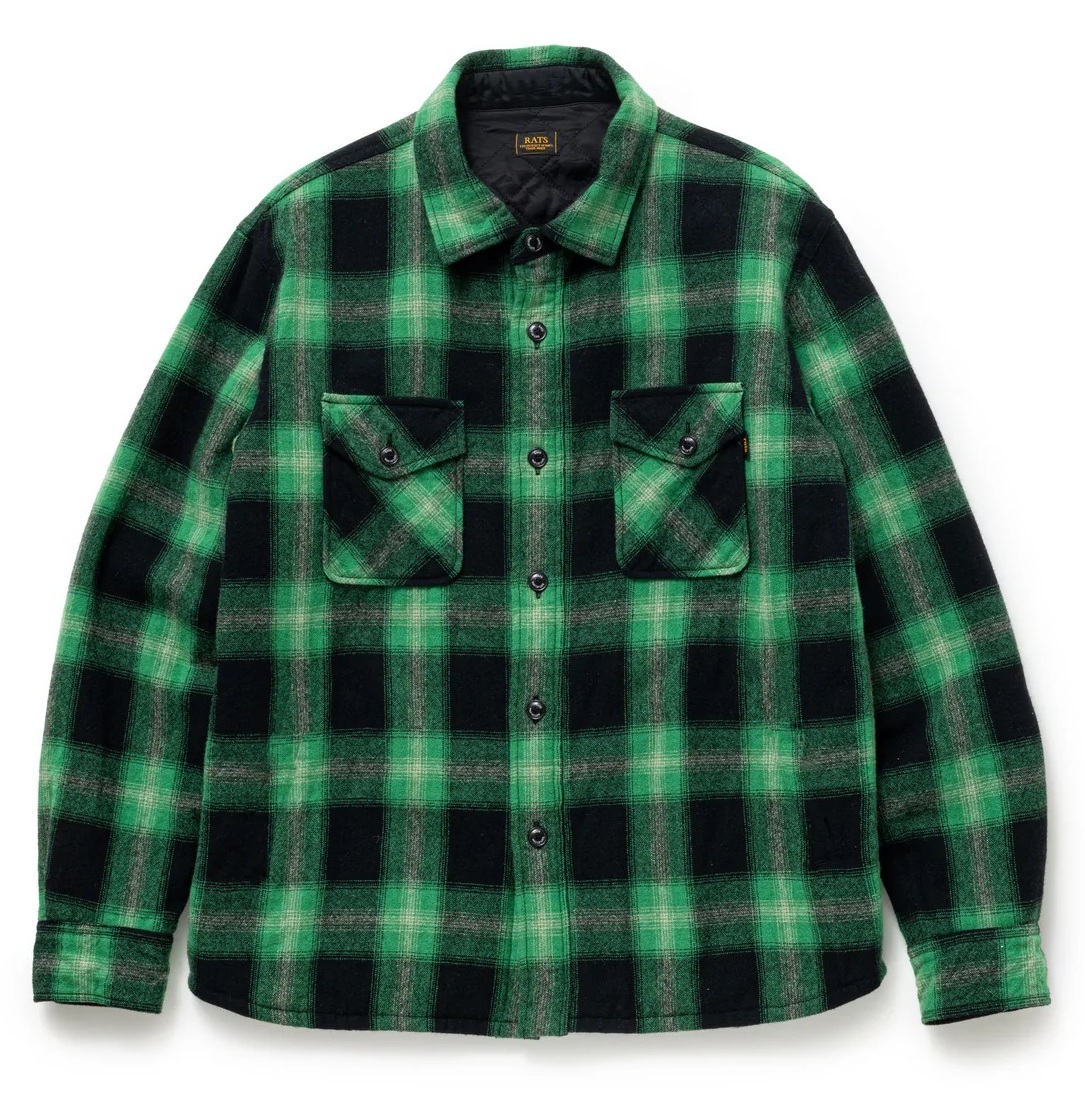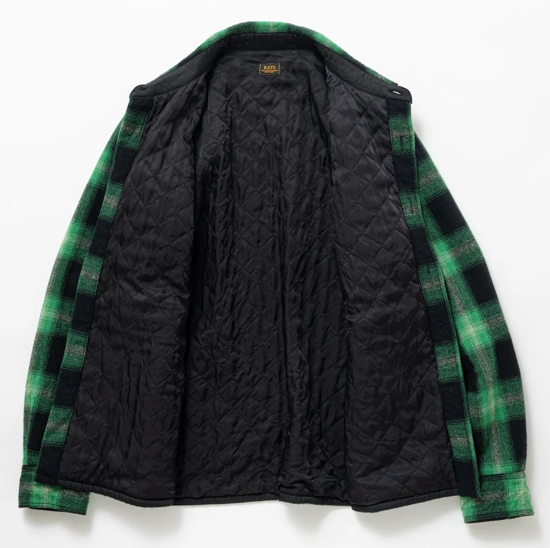 表面を微起毛させたオリジナルウールチェック素材、裏地に中綿入りダイヤキルティング生地を採用したRATSのシャツジャケットです。