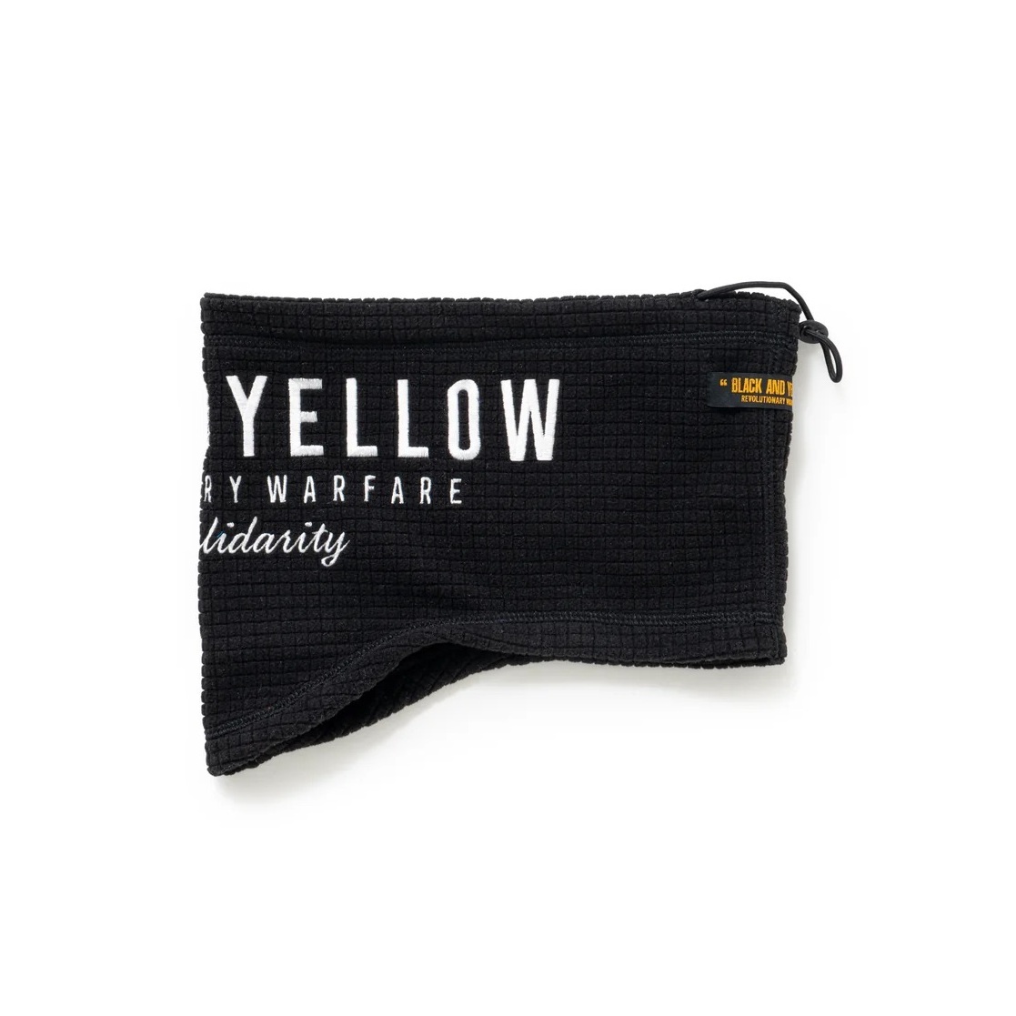 正面にBLACK AND YELLOW・レターグラフィックを直刺繍、背面中央に織りネームを叩きつけています。