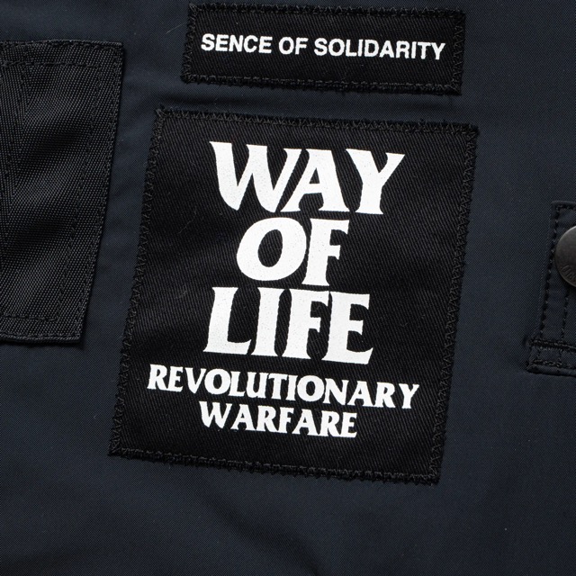 左胸にワッペン、右胸に3D刺繍、右肩にプリント・ナイロンテープをあしらった、高インパクトのデザインになります。