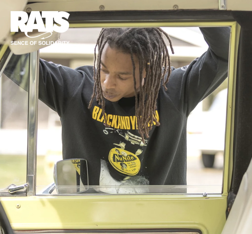フロントにオリジナルグラフィック、スリーブにサークルモチーフロゴをインクジェットプリントで表現、背面左脇にRatモチーフのワンポイント刺繍を配置しています。